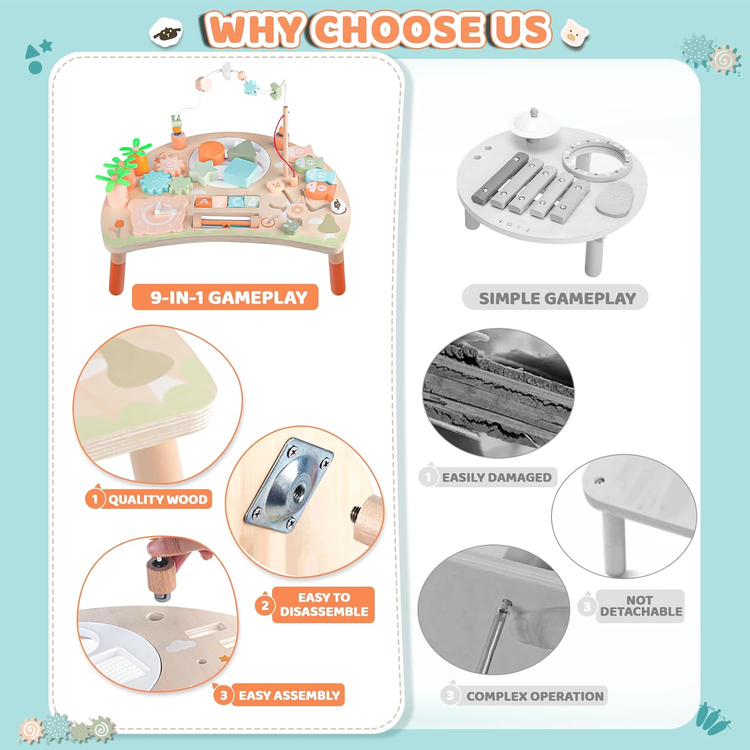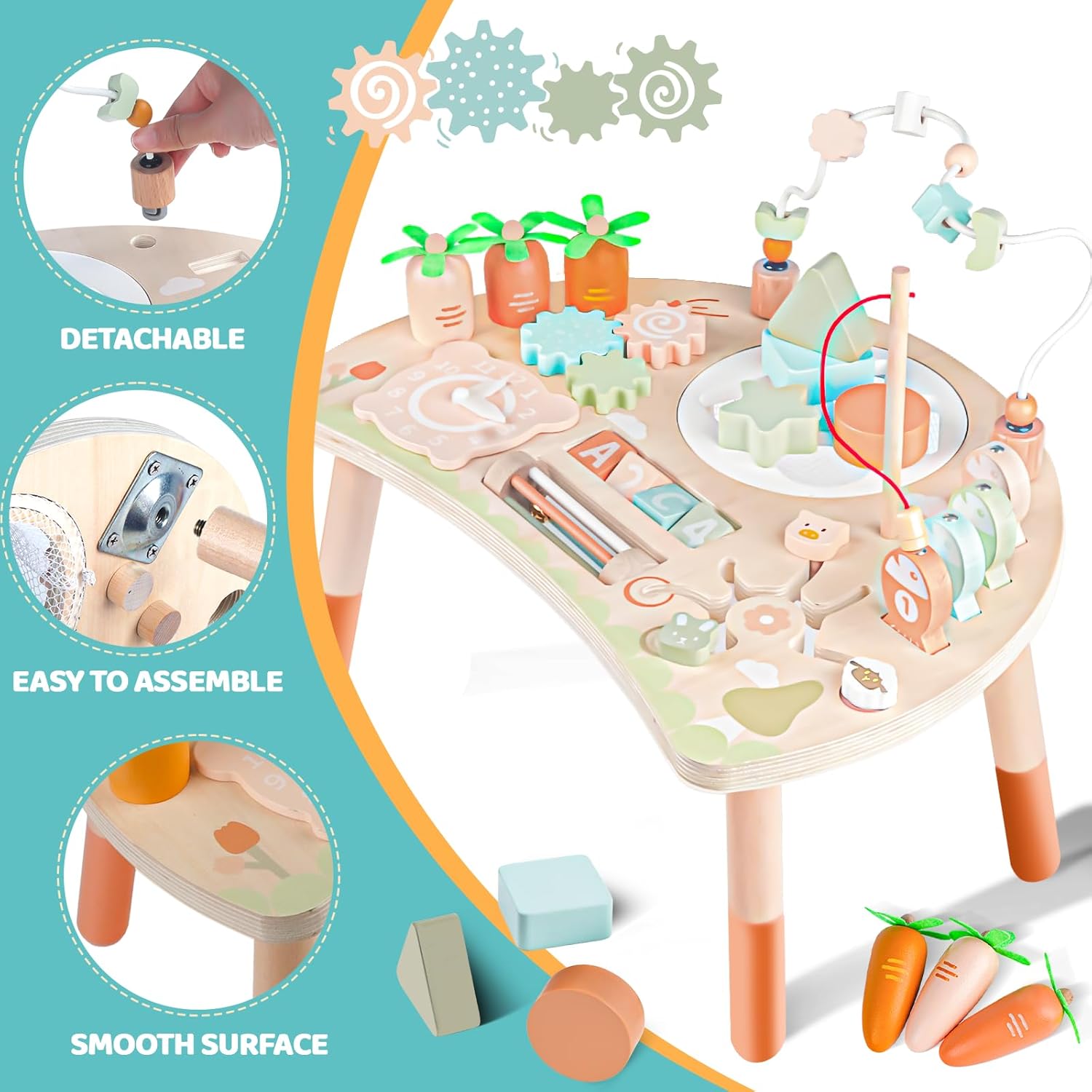 🧩 9 Fun Learning Activities – Includes a bead maze, fishing game, learning clock, spinning gears, shape sorter, animal maze, carrot harvest, rotating blocks, and rattle roller — endless fun in one table!